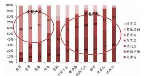 图表2:消费者购买生鲜商品和普通商品的渠道对比情况(单位:%)