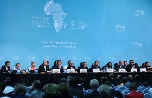 2015年12月15日至19日,世贸组织第十届部长级会议在肯尼亚内罗毕举行,今年正值世贸组织成立20周年,也是世贸组织部长级会议首次在非洲大陆召开,来自162个成员超过3000名代表出席会议。商务部部长高虎城率由商务部、外交部、发展改革委、财政部、农业部、海关总署和驻世贸组织代表团组成的中国代表团出席会议。经过几天几夜艰苦的谈判,会议通过了《内罗毕部长宣言》及9项部长决定,承诺继续推动多哈议题,成果丰富。一是世贸组织成员首次承诺全面取消农产品出口补贴,并就出口融资支持、棉花、国际粮食援助等方面达成了新的多边纪律;二是达成了近18年来世贸组织首个关税减让协议——《信息技术协定》扩围协议,涉及1.3万亿美元国际贸易;三是在优惠原产地规则、服务豁免等方面切实给予最不发达国家优惠待遇;四是正式批准阿富汗和利比里亚加入世贸组织。